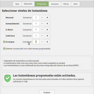 En el apartado Programar, podrás elegir la periodicidad con la que se realicen las copias del sistema, esto dependerá en su totalidad del espacio disponible para guardar o almacenar las mismas, ya que cada copia puede pesar hasta 40 gigas, es decir dependerá del tamaño de nuestra instalación y de lo que queramos resguardar en la imagen. Yo elegiré una copia durante el arranque para esta demostración, y configurare para que actualice esa misma en cada inicio del sistema, así mantendré la copia de seguridad lo más actualizada posible. En los apartados filtro y usuarios lo ideal es seleccionar que incluya todos los archivos.